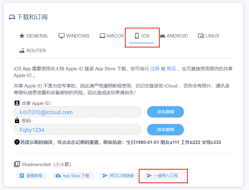 登录番茄花园官网 ,在 用户中心 选择 iOS 标签,在 Shadowrocket 点击“一键导入订阅”即可导入服务器节点。