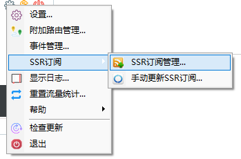 下载安装后点击主页面右下角齿轮图标,或右键系统托盘图标,打开菜单后依次选择 SSR订阅 —— SSR订阅管理